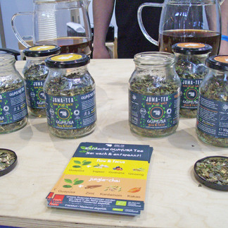 Und dann war noch der Tee: Juma-Tea heißt der Hersteller, der mir sein Getränk zum Probieren anbot. Das war inzwischen auch dringend nötig, denn nach all den Kostproben bei den Bio-Brennereien und ähnlichen Anbietern kamen bereits die ersten Zweifel auf, ob ich danach überhaupt noch in der Lage sein werde, die Messehalle auf eigenen Füßen zu verlassen.