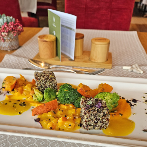 Die Speisenauswahl ist auf die Anamnese abgestimmt. Es gibt immer Mahlzeiten, auch während der Reinigungstage. Das Auge isst im Sonnhof Tirol definitiv mit. Der Teller ist immer bunt und unerwartet üppig befüllt. Besonders in Erinnerung geblieben sind mir eine Kohlrabisuppe, Brokkoli und Kürbis an Safransauce mit Quinoa sowie Amaranth mit Quitte, Himbeer und Lavendelsauce. Zum Frühstück durfte ich warme Breie essen. Wichtig ist es, wie auch schon bei anderen Fastenkuren gelernt, Essen und Trinken 30 Minuten davor und danach voneinander zu trennen. Denn die Verdauungssäfte arbeiten effektiver, wenn sie nicht verdünnt werden. Auch das eine einfache Gewohnheit, die man zuhause weiterführen kann. Frische Produkte werden vom familieneigenen Bauernhof bezogen, der pestizidfrei und nach höchsten Tierwohlstandards wirtschaftet. Es wird saisonal, regional, mit viel Gemüse, Ghee und wärmenden Gewürzen gekocht. Zusätzlich hat jeder Gast auf ihn abgestimmte ayurvedische Kräuterkapseln bei sich am Tisch.